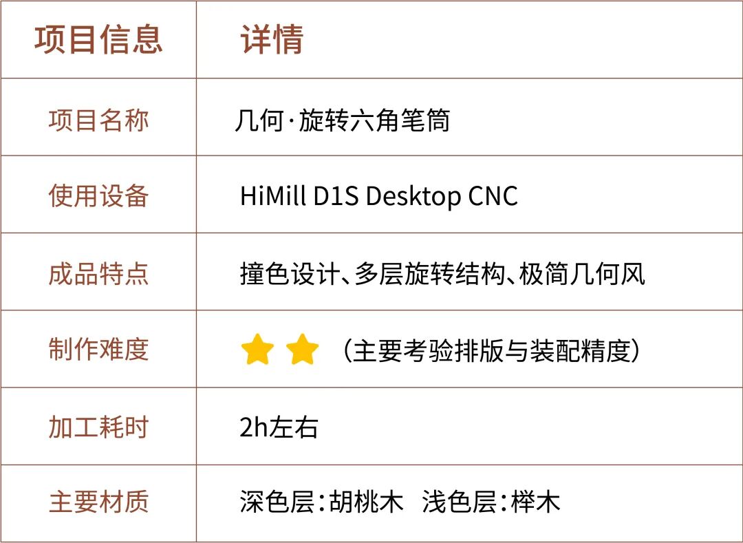 厭倦了凌亂的桌面?今天分享一個既實(shí)用又解壓的DIY項(xiàng)目!利用HiMill D1S桌面CNC的批量加工能力,用兩種實(shí)木打造多層六邊形旋轉(zhuǎn)筆筒,既能收納文具,又能旋轉(zhuǎn)把玩,妥妥桌搭神器~ 附制作圖紙與批量切割技巧!