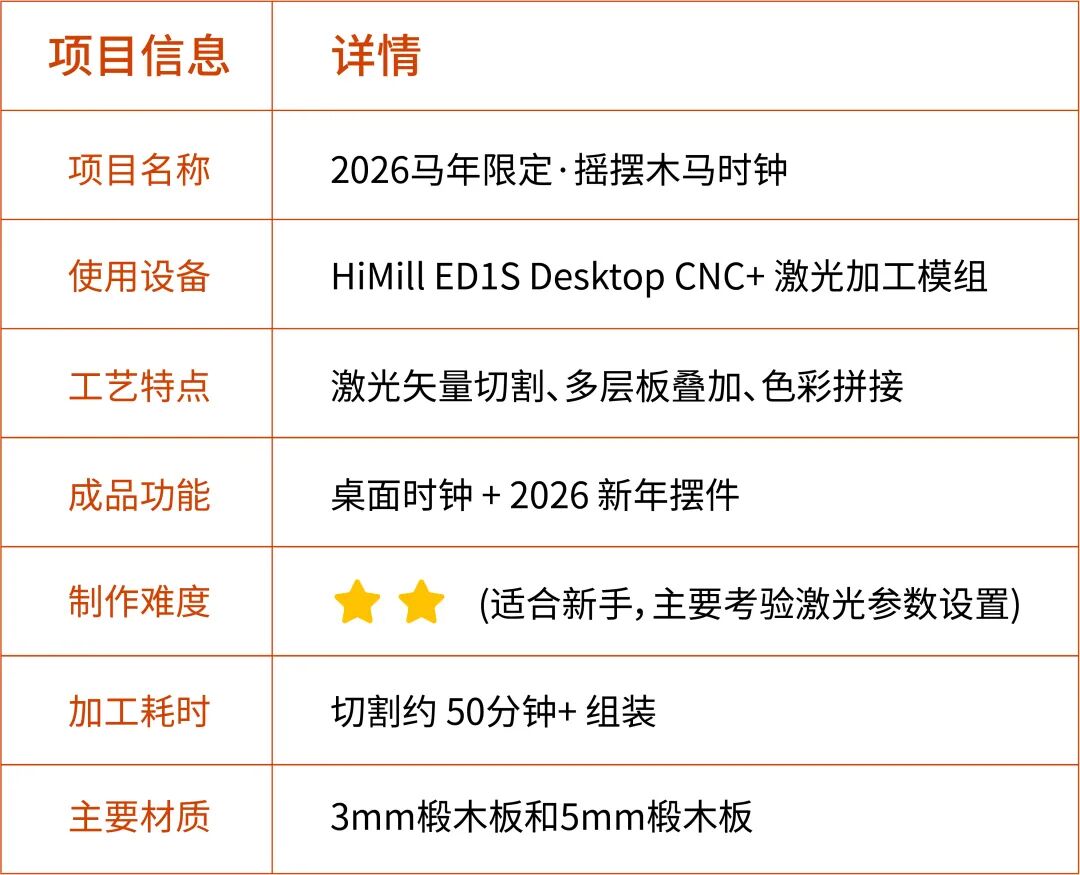 2026年是中國(guó)農(nóng)歷馬年,有什么比親手做一個(gè)充滿童趣的“搖擺木馬”時(shí)鐘更適合作為新年禮物呢?愿這份親手制作的心意,承載馬年“一馬當(dāng)先、萬事順意”的美好祝福,伴你開啟順?biāo)煨職q!本期教程,我將給HiMill ED1S換上激光模組,利用激光切割工藝,將多層木板拼貼成這款既復(fù)古又現(xiàn)代的桌面時(shí)鐘。相比CNC銑削,激光切割能帶來更利落的直角和獨(dú)特的焦糖色切邊。